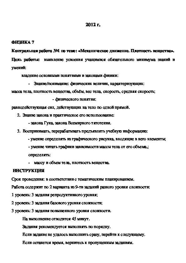 Контрольная работа №1 по теме «Механическое движение. Масса тела. Плотность вещества» (физика, 7 класс)