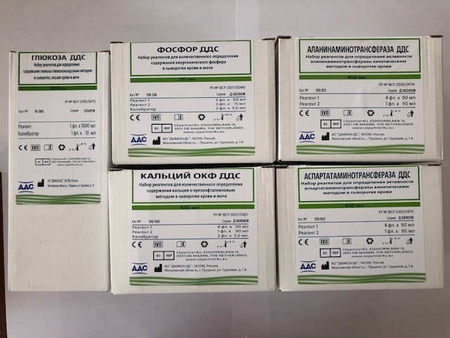 1 | Набор для клинического анализа кала Набор реагентов для клинического анализа кала («Диахим-Набор реагентов для клинического анализа кала») Россия Назначение: для обнаружения в кале скрытой крови, билирубина и стеркобилина и микроскопического исследования кала в клинико-диагностических лабораториях. Количество анализов: 100 определений — скрытая кровь, 50 определений — стеркобилин, 200 определений — билирубин, 2000 определений — микроскопические исследования | 20. | НАБОР | 1 430.00 | 3.0 | 4 290.00 |