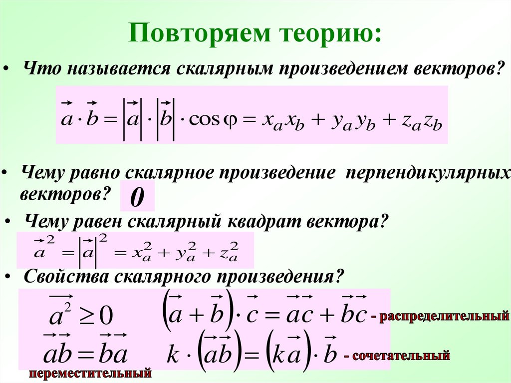 — ввести понятие угла между векторами и скалярного произведения векторов, рассмотреть формулу скалярного произведения в координатах;