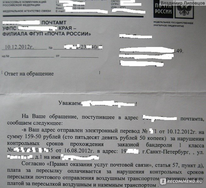 Согласно постановлению, контрольный срок пересылки корреспонденции из Москвы в Санкт-Петербург составляет 4 дня.
