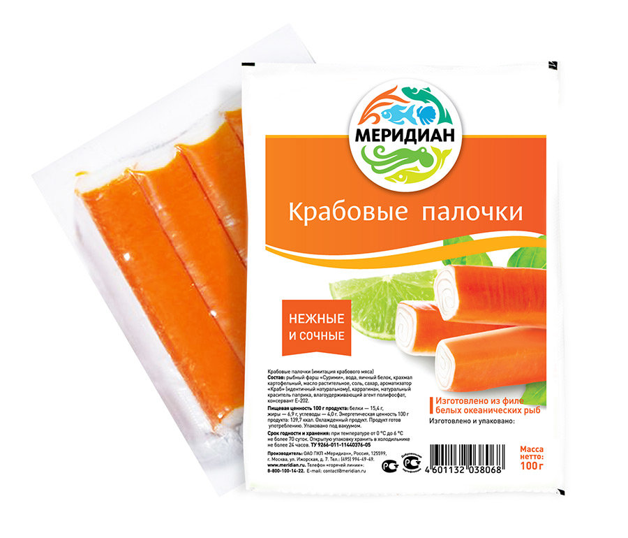 Крабовые палочки замороженные торговой марки «Красная цена» . Образец был приобретён в магазине «Пятерочка» по адресу: г. Москва, ул. Михайлова, д. 8. В этих крабовых палочках не было обнаружено опасных для здоровья бактерий группы кишечной палочки и золотистого стафилококка, однако в них были обнаружены сульфитредуцирующие клостридии – анаэробные спорообразующие микроорганизмы, распространенные в почве, воде, фекалиях. Они могли попасть в продукт из-за несоблюдения на перерабатывающем предприятии санитарно-гигиенических норм. Продукт не содержит консервантов. В составе крабовых палочек была обнаружена ДНК сои. Кроме того, в них слишком много крахмала. Это может говорить о том, что производитель пытался сэкономить на сырье. Массовая доля жиров в крабовых палочках соответствует установленным требованиям, однако в них недостаточно белка.
