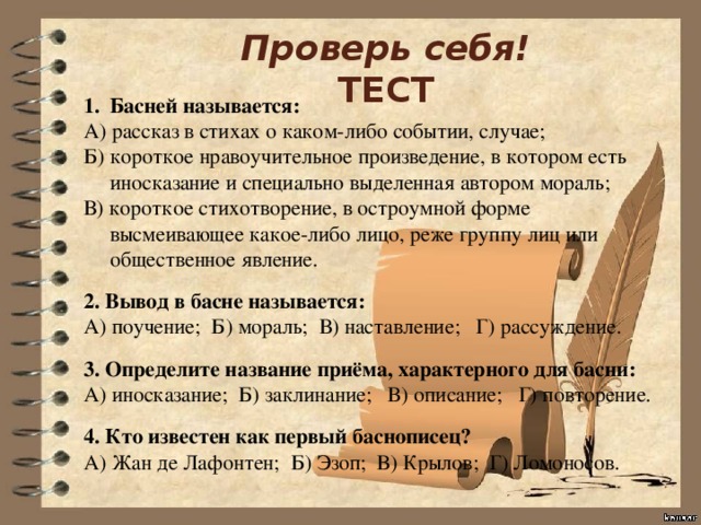 1.Краткий нравоучительный стихотворный или прозаический рассказ, в котором есть аллегория, иносказание:
