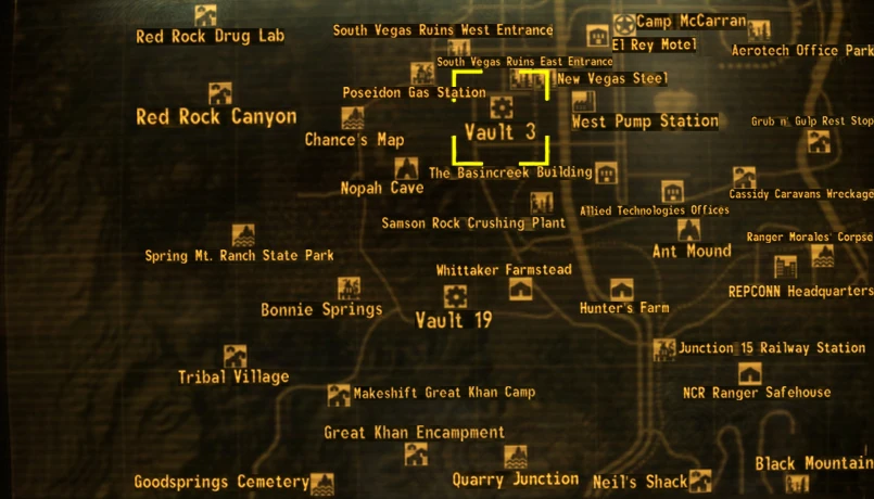 После получения вводной, смотрим по карте, где обитает Шеф-Шеф. Окажется что двигаться вам недалеко, выходим за ворота лагеря Маккарран и двигаемся прямо к западному входу руин Саут-Вегаса, именно там можно найти Шеф-Шефа. Прогулка будет непростая, по пути вам будет встречатся много Чертей, которые хоть и не особо сильные, но все равно приносят неудобства.