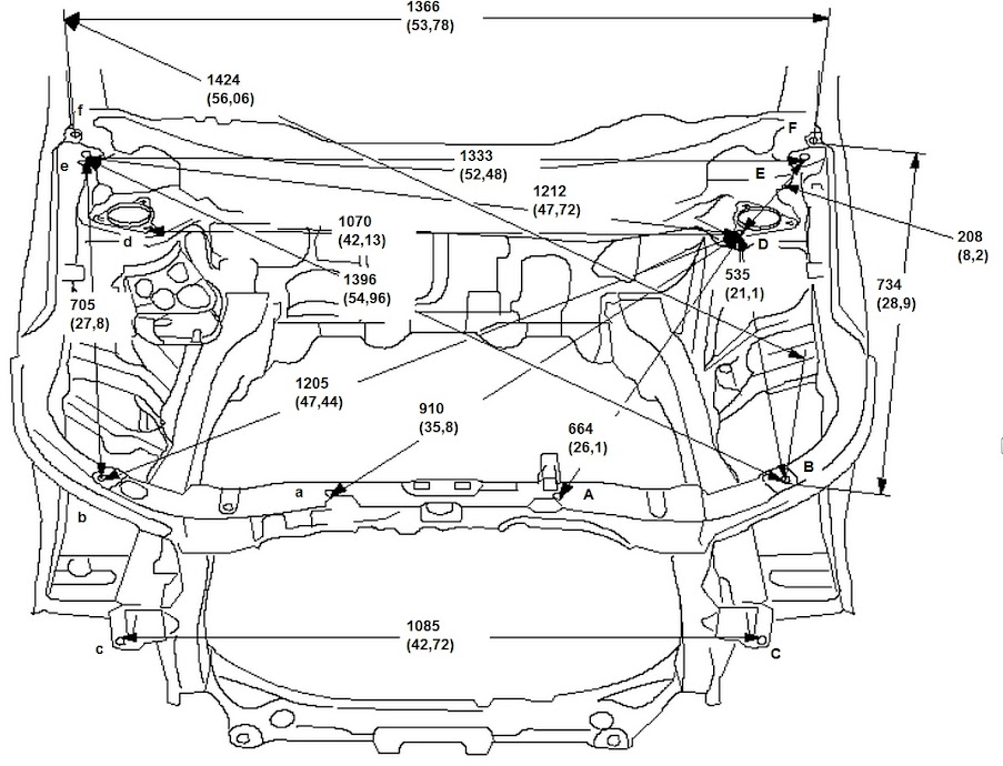 В случае восстановления целостности конструкции задней части кузова данных двух точек достаточно для выверки положения и поддержки передней части автомобиля.