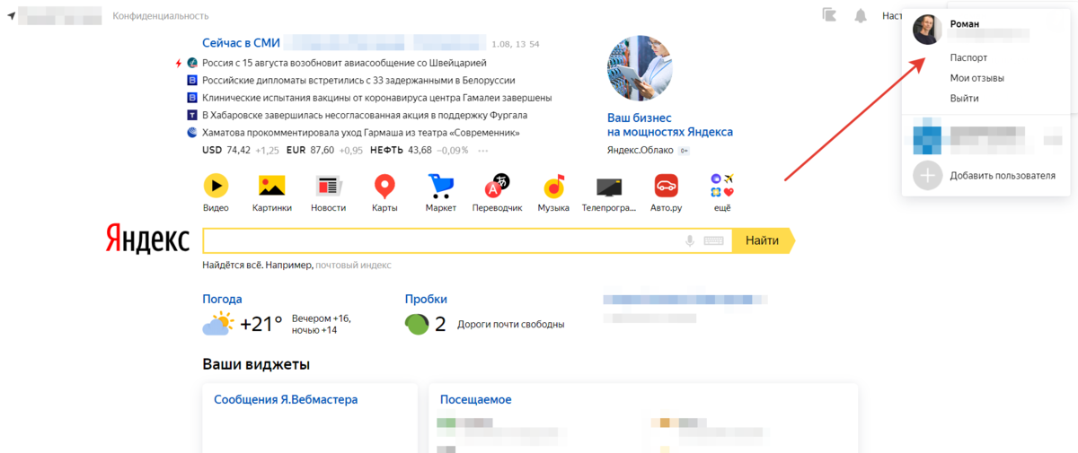 Нажимаем на значок пользователя в верхнем правом углу страницы. Выбираем пункт «Паспорт».
