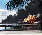Вид на гавань Перл Харбор и ряд линкоров во время атаки японцев