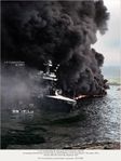 USS West Virginia затопленный и в огне после нападения на Пёрл-Харбор.
