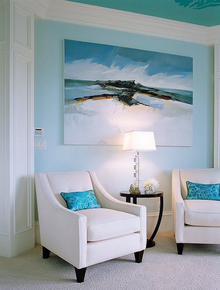 Изысканное цветовое решение и убранство комнаты могут деликатно подчинить себе бунтарский дух изобразительного искусства. Тонкая и точная работа мариниста в бирюзовом интерьере — вовсе не пошлость, а проявление практичности и вкуса.