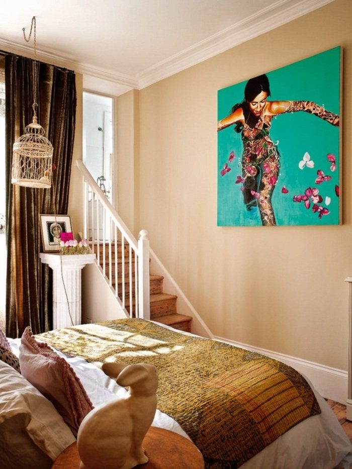 Самоценность картин позволяет не только располагать их в условном красном углу, а вообще обращаться с ними довольно небрежно, без пиетета. Поставленные на пол полотна придают комнате богемный шик без всякой надуманности.