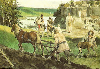 Историки считают, что с давних времён восточные славяне поселились в VI веке в среднем течении Днепра, примерно там, где сейчас находится город Киев. Расселение славянских племён шло вверх по течению Днепра и его притокам. Здесь начинались густые леса - сначала лиственные, а севернее - смешанные и хвойные (об этой природной зоне мы с вами говорили на предыдущих уроках). Переселенцы попадали в непривычные условия. На новом месте славяне селились обычно по берегам рек и озёр несколькими большими семейными группами. Правда, семьи тогда были по 15-20 человек: глава семьи с женой, их взрослые сыновья с жёнами, их дети, а иногда и внуки. Три - четыре двора селились вместе. В домах славян пол был на метр углублен в землю, стены сложены из тонких стволов деревьев - жердей, очищенных от веток и коры. Жерди соединены между собой деревянными шипами, связаны для прочности гибкой корой. Крыша тоже из жердей, а на ней - толстый слой соломы. В углу находилась сложенная из камня печь - она обогревала дом, на ней готовили еду. Печь топилась по-черному - это значит, что дымовой трубы не было, и весь дым выходил через оконца, двери, отверстия в кровле.Внутри такого дома было всегда прохладно, темно и сыро. Окошки, прорубленные в стенах, на ночь и в холода закрывали досками или соломой - ведь стекол тогда не было. В доме все свободное место занимали стол и 2-3 лавки. В углу лежало несколько охапок сена, покрытых звериными шкурами, - это постели. Жизнь переселенцев была нелёгкой. Как и все первобытные народы, славяне занимались собирательством и охотой. Они собирали мёд, ягоды, грибы, орехи, охотились на кабанов, лосей, медведей, в реках ловили рыбу. Сейчас мы тоже ходим в лес по грибы-ягоды, ловим рыбу. Но для нас это отдых, а для наших предков это был огромный труд, и нелёгкий. Ведь продуктов нужно было заготовить на весь род. С давних времён славяне занимались земледелием. Пахали деревянными сохами на быках. Сеяли рожь, пшеницу.