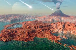 3 млрд. 900 млн. лет Землю атаковали обломки,- метеориты, оставшиеся от сформировавшейся Солнечной системы. В этих метеоритах содержалась небольшое количество воды- важной составляющей жизни на Земле. Эти метеориты атаковали Землю 20 млн. лет, и вода, собиравшаяся на твёрдом грунте, превратилась в гигантские водоёмы, наполнившие Землю. Так поверхность Земли покрыла вода.