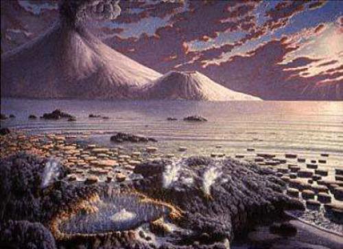 3 млрд. 500 млн.лет на мелководье образовались древние бактерии- строматолиты. Они высвобождали газ- кислород, медленно наполнявшийся в океане. Через 2 млрд. лет уровень кислорода был более высоким, и планета стала вращаться медленнее. Продолжительность дня равнялась 16 часам. Единственные живые организмы, обитавшие тогда- одноклеточные бактерии.