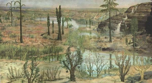 4. Девонский период отличается бурным развитием разнообразных форм жизни и освоением новых экологических ниш. Девон охватывает временной промежуток в 60 млн. лет. Появляются первые наземные позвоночные, пауки, насекомые. У животных суши формируются легкие. Хотя, по-прежнему, преобладают рыбы. Царство флоры этого периода представлено пропапоротниками, хвощевидными, плаунами и госеменными.