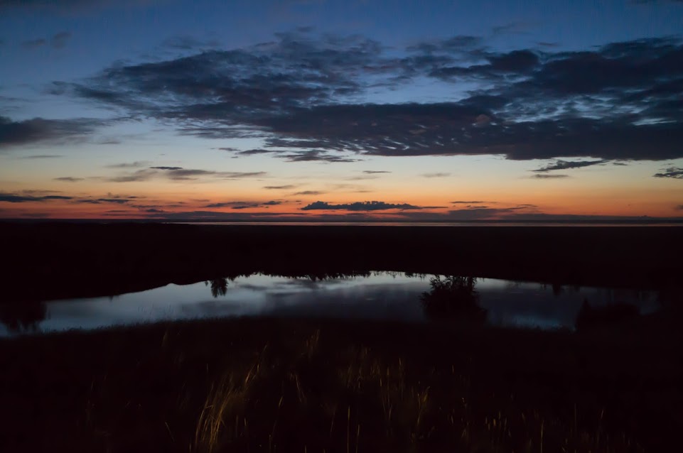 Теперь, собственно, про наш опыт. Впервые мы собрались с экспедицией на озеро в августе 2013-го года. Из города выехали субботним вечером, и уже незадолго до заката мы кружили неподалеку от озера. Первый раз мы искали максимально короткий путь к озеру, свернув за Москаленками. Дорога там оказалась так себе: местами встречался просто щебень, местами останки асфальта, по которым даже жалко ехать было, из уважения к их возрасту. Однако мы, увлекаемые беспощадным навителом, все стремились вперед. Из-за качества дорожного покрытия ехали мы медленнно, солнце начало клониться к горизонту. В общем, перед самым закатом мы выбрались на грунтовую дорогу, идущую вокруг озера на приличном расстоянии от него. Мы быстро поняли, что на берегу озера заночевать не получится - даже в сумерках было видно, насколько относительным здесь является понятие "берег". Посему мы отправились искать Амринскую балку, рассудив, что на ее берегах точно растет что-то типа деревьев, а значит - с дровами проблем не будет. Беспокойство насчет дров для костра посетило нас близ озера - ничего, кроме травы, не росло. К счастью, мы нашли подходящий для стоянки берег достаточно быстро, хотя к этому моменту видимость была минимальной, а с лугов поднималось голодное комарье. Долго место мы не выбирали, остановились на пригорке. Козырное место на самом берегу водоема заняла не очень трезвая компания. Игнорируя раздающиеся с берега звуки праздника, мы поставили наши две палатки и после легкого ужина легли спать.