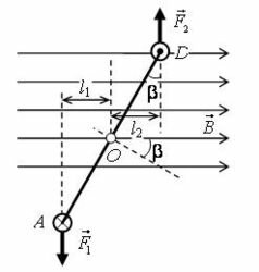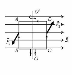 На участки AD и BC магнитное поле действуют с силами, которые меняются от нуля до максимального значения (в зависимости от угла поворота рамки β) и стремятся растянуть рамку (на рис. 5 эти силы не указаны). На участки AB и CD магнитное поле действуют с постоянными силами \(~\vec F_1\) и \(~\vec F_2\), которые направлены в противоположные стороны (на рис. 5 а силы направлены перпендикулярно плоскости рисунка) и стремятся повернуть рамку вокруг оси OO´. Таким образом, эти силы \(~\vec F_1\) и \(~\vec F_2\) создают вращающий момент \(~M = F_1 \cdot l_1 + F_2 \cdot l_2\) , где \(~F_1 = F_2 = I \cdot B \cdot l\) (угол α = 90°), \(~l_1 = l_2 = \frac{AD}{2} \sin \beta = \frac{b}{2} \sin \beta\) , \(~l = AB = CD = a\) . Тогда