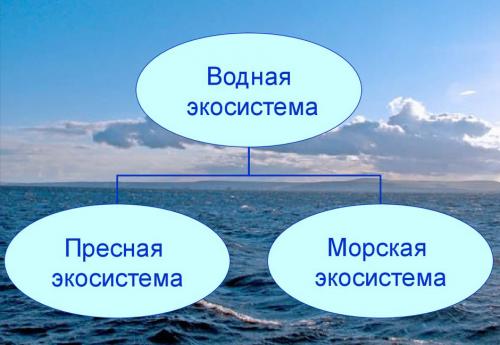 Компоненты водной экосистемы делятся на два вида: абиотические (вода, свет, давление, температура, состав почвы дня, состав воды) и биотеческие. Биотика, в свою очередь, разделяется на следующие подвиды: Продуценты — организмы, производящие органические вещества с помощью солнца, воды и энергии. В водных экосистемах продуцентами являются водоросли, в мелководных водоемах — прибрежные растения. Редуценты — организмы, потребляющие органику. Это разнообразные виды морских животных, птиц, рыб, земноводных. Основные типы водных экосистем В экологии водные экосистемы принято разделять на пресноводные и морские. В основе этого деления лежит показатель солености воды. Если в литре воды содержится более 35% солей — это морские экосистемы. К морским относятся океаны, моря, соленые озера. К пресноводным — реки, озера, болота, пруды. Еще одна классификация водных экосистем базируется на таком признаке, как условия создания. Здесь выделяют природные и искусственные. Природные созданы при участии сил природы: моря, озера, реки, болота. Искусственные водные экосистемы создает человек: искусственные пруды, водохранилища, дамбы, каналы, водные фермы. Естественные водные экосистемыПресноводные экосистемы Пресноводные экосистемы — это реки, озера, болота, пруды. Все они занимают лишь 0,8% поверхности нашей планеты. Хотя в пресных водоемах обитает более 40% известных науке рыб, пресноводные экосистемы все равно значительно уступают в видовом разнообразии морским. Главным критерием отличия пресноводных водоемов является скорость течения воды. В этой связи выделяют стоячие и проточные. К стоячим относятся болота, озера и пруды. К проточным — реки и ручьи.Для стоячих водных экосистем характерна ярко выраженное распределение биотических организмов в зависимости от слоя воды: В верхнем слое (литорали) главным компонентом является планктон и прибрежные заросли растений. Это царство насекомых, личинок, здесь обитают черепахи, амфибии, водоплавающие птицы, млекопитающие. Верхний слой водоемов является охотничьими угодьями для цапель, журавлей, фламинго, крокодилов, змей. Средний слой водоема называется профундаль. Он получает намного меньше солнечного света, а питанием служат вещества, оседающие их верхнего слоя воды. Здесь обитают хищные рыбы. Нижний слой воды называется бенталь. Огромную роль играет состав почвы, ила. Это место обитания придонных рыб, личинок, моллюсков, ракообразных. Морские экосистемы Самой большой морской экосистемой является Мировой океан. Он подразделяется на более мелкие: океаны, моря, соленые озера. Все они занимают свыше 70% поверхности нашей планеты и являются важнейшей составляющей частью гидросферы Земли. В морских экосистемах главным компонентом, продуцирующим кислород и питательные вещества, является фитопланктон. Он формируется в верхнем слое воды и под действием солнечной энергии вырабатывает питательные вещества, которые потом оседают в более глубокие слои водоема и служат питанием для остальных организмов. Большие морские экосистемы — это океаны. В открытом океане видовое разнообразие невелико по сравнению с прибрежными зонами. Основная масса живых организмов сосредоточена на глубинах до 100 метров: это различные виды рыб, моллюсков, кораллы, млекопитающие. В прибрежных зонах морских экосистем видовое